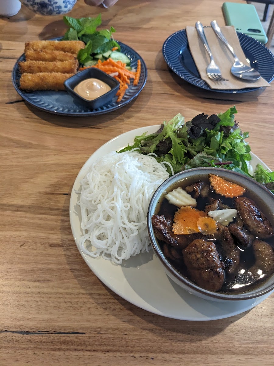 The menu is clearly crafted with care, focusing on classic Vietnamese dishes that feel both familiar and exciting. One of the standout highlights is the Bun Cha Hanoi, a dish that brings together grilled pork, fresh herbs, rice noodles, and a perfectly balanced dipping sauce. It’s light yet satisfying, making it a favourite for anyone looking for healthy options without compromising on flavour. The Bun Nem Cua, featuring crispy crab spring rolls served with vermicelli, adds texture and richness that keeps every bite interesting.