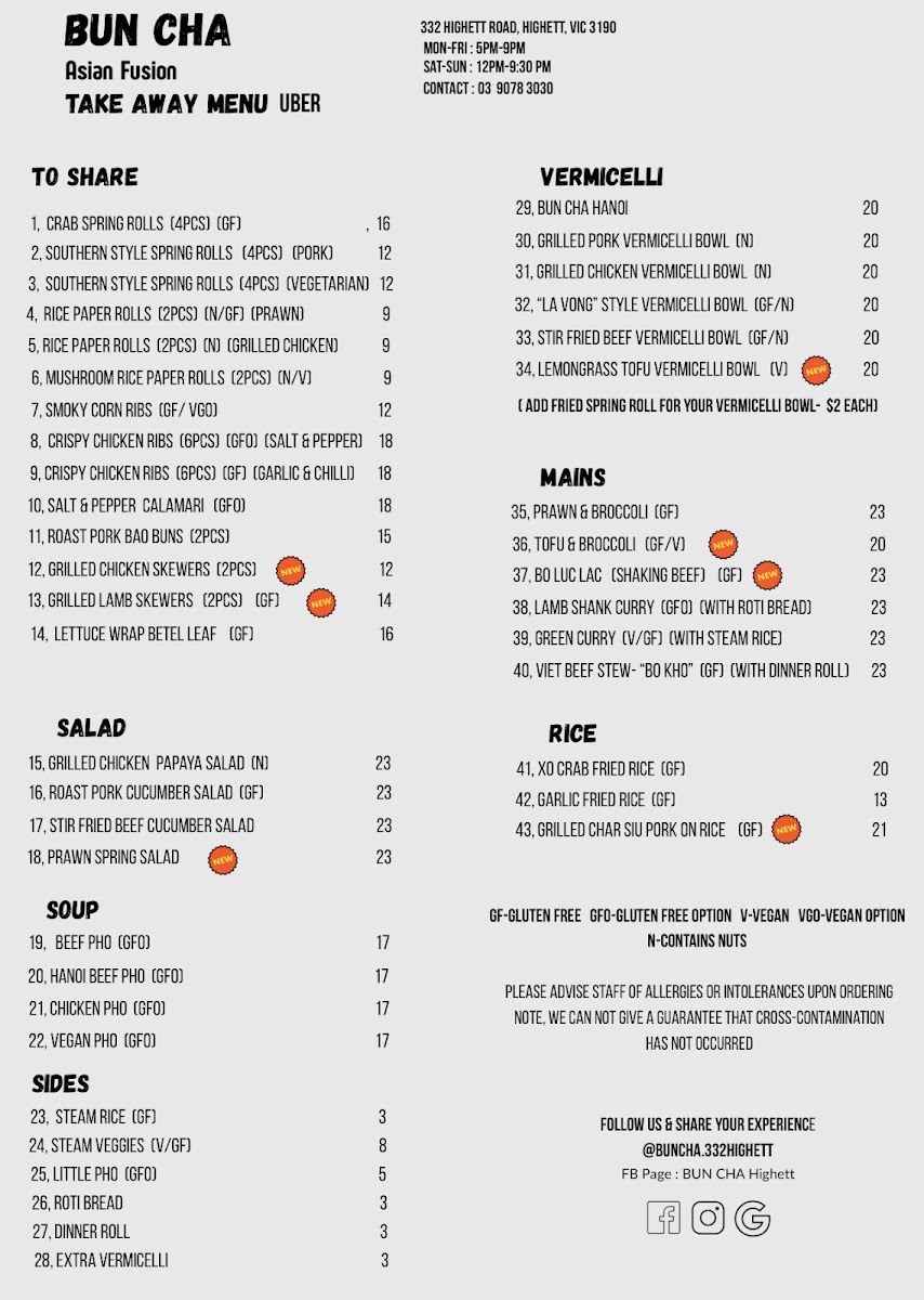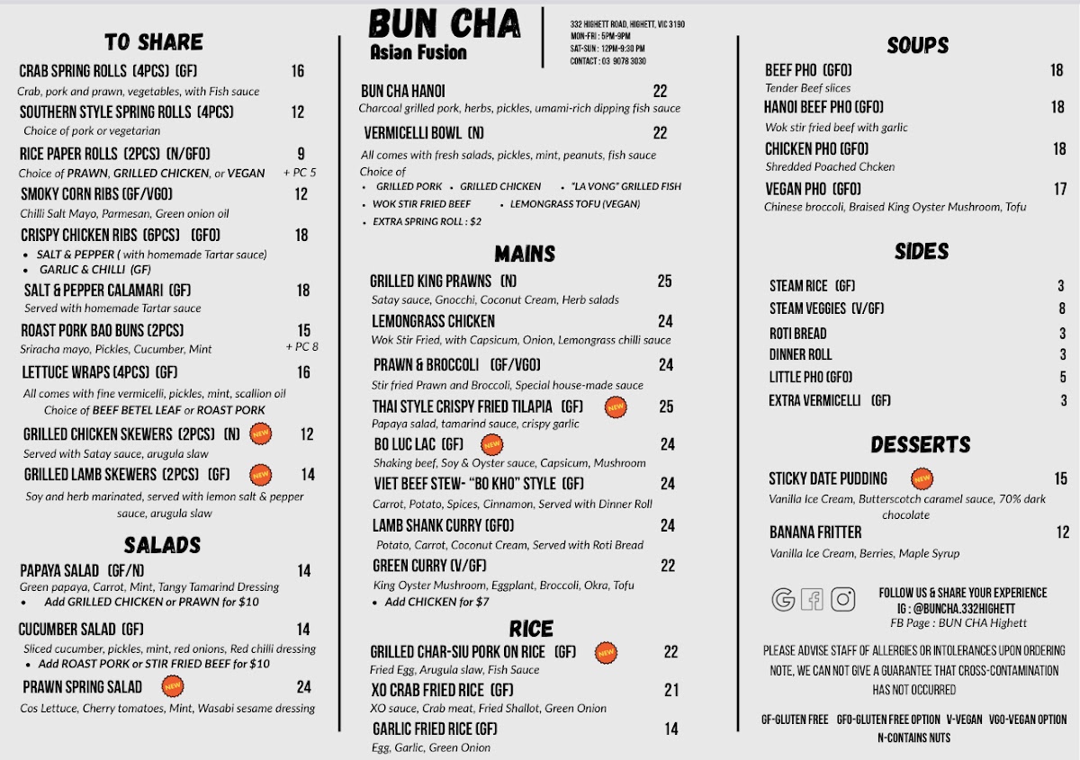 Bun Cha Highett, located at 332 Highett Rd, Highett VIC 3190, Australia, offers a vibrant and diverse menu that showcases the rich flavors of Vietnamese cuisine. Whether you're dining in or taking away, their menu provides a wide range of options that cater to various tastes and dietary preferences.