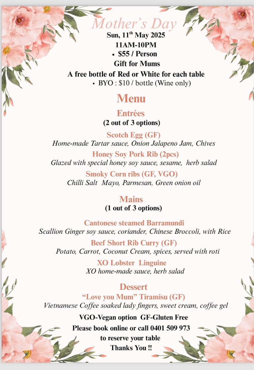 We have created a special menu for Mother’s day on 11 May 2025. Set menu is only $55 per person with entrée, main, dessert. Free 1 bottle of wine for each table booked.